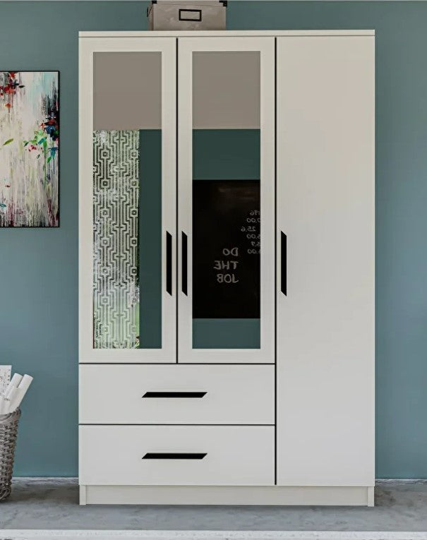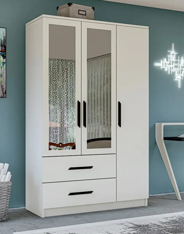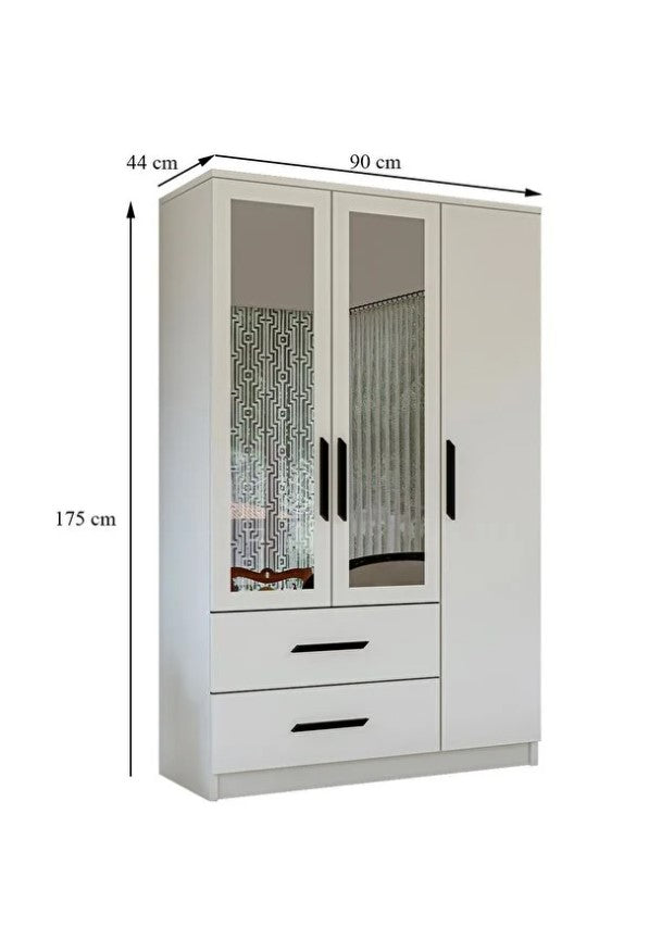 Revasser Mobilya GD330 3 Kapı 2 Çekmeceli Aynalı Siyah Kulplu Beyaz Gardırop